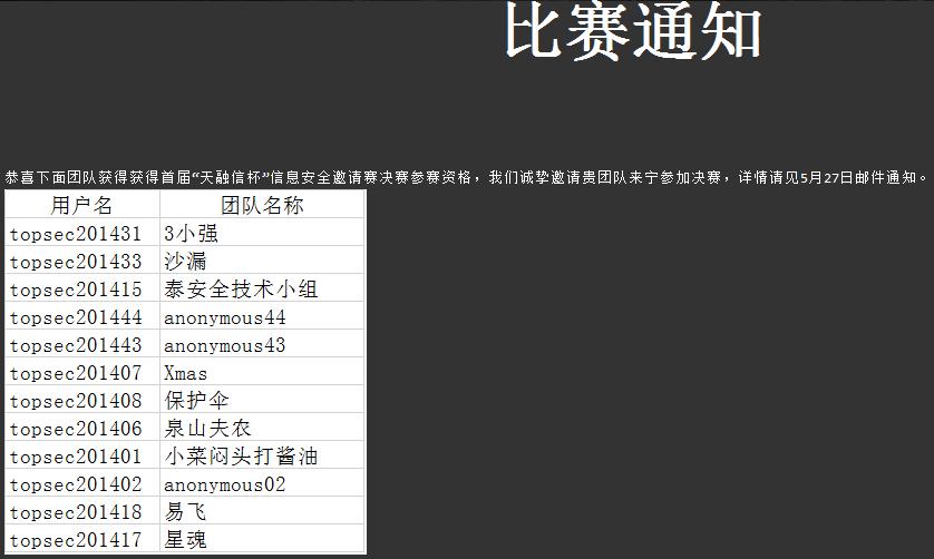 “天融信杯”信息安全邀请赛由北京天融信科技有限公司南京分公司主办、东南大学-天融信信息安全与移动互联技术联合研究中心承办。参赛对象为省内高等院校在校员工,每支代表队限1至3人组成,每所高等院校最多可推荐2支代表队参赛。该邀请赛的初赛于2014年5月24日进行,约50支代表队参加。“泰安全技术小组”以初赛第三名的成绩晋级决赛,决赛将于2014年6月7日进行。