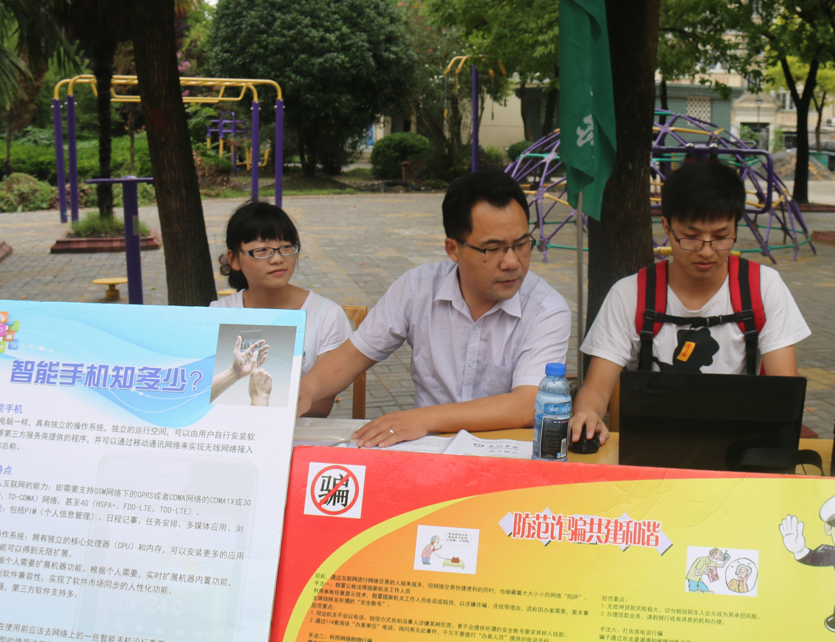 6月30日在滨江社区,党员师生主要面向社区居民普及电脑杀毒,垃圾清理等计算机网络知识;指导居民如何安全上网,免受网上不法分子的诈骗;在留守老人的电脑上安装微信,方便老人与外出务工的子女在线视频通讯;并上门提供维护和咨询服务。