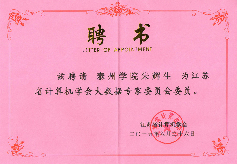 公司朱辉生教授被聘为江苏省计算机学会大数据专家委员会委员。