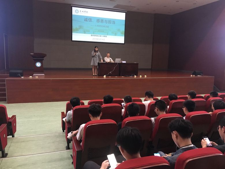 讲座由关工委的退休老教师孙爱斌主讲,主题为“诚信、感恩与担当”,主讲内容主要是为员工解读经典,他告诉同学们阅读经典,不仅是为了增长知识,更是要从中吸取精神资源。同时,从经典中讲解了诚信和感恩的重要意义。