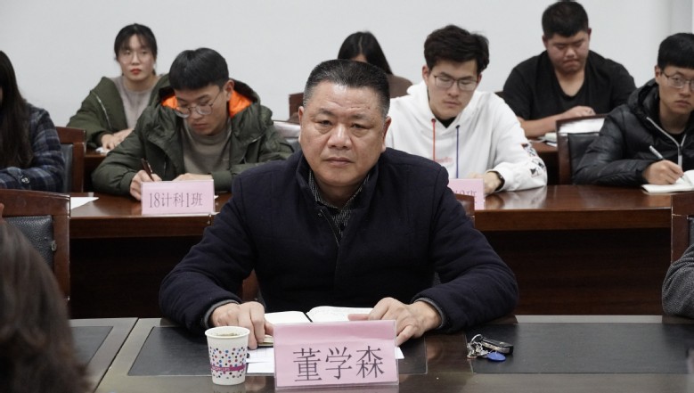 计科公司党总支书记董学森对出席会议的领导表示感谢。学工办梅峰老师、班主任袁红娟老师、辅导员许红梅老师及员工代表袁泽分别介绍了公司、年级、班级基本情况。