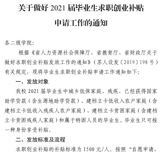 关于做好 2021 届毕业生求职创业补贴 申请工作的通知
