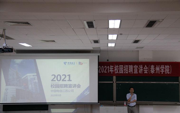 中国电信公司泰州分公司代表分别从公司业务、企业环境、企业文化、公司岗位需求情况、薪酬福利、培养体系、未来发展和招聘日程安排与招聘渠道等几个方面对电信公司进行了详细的介绍,为同学们提供了IT技术研发、基础线路维护等岗位,表达了公司求贤若渴的心情,也充分地调动了在场员工的就业热情。