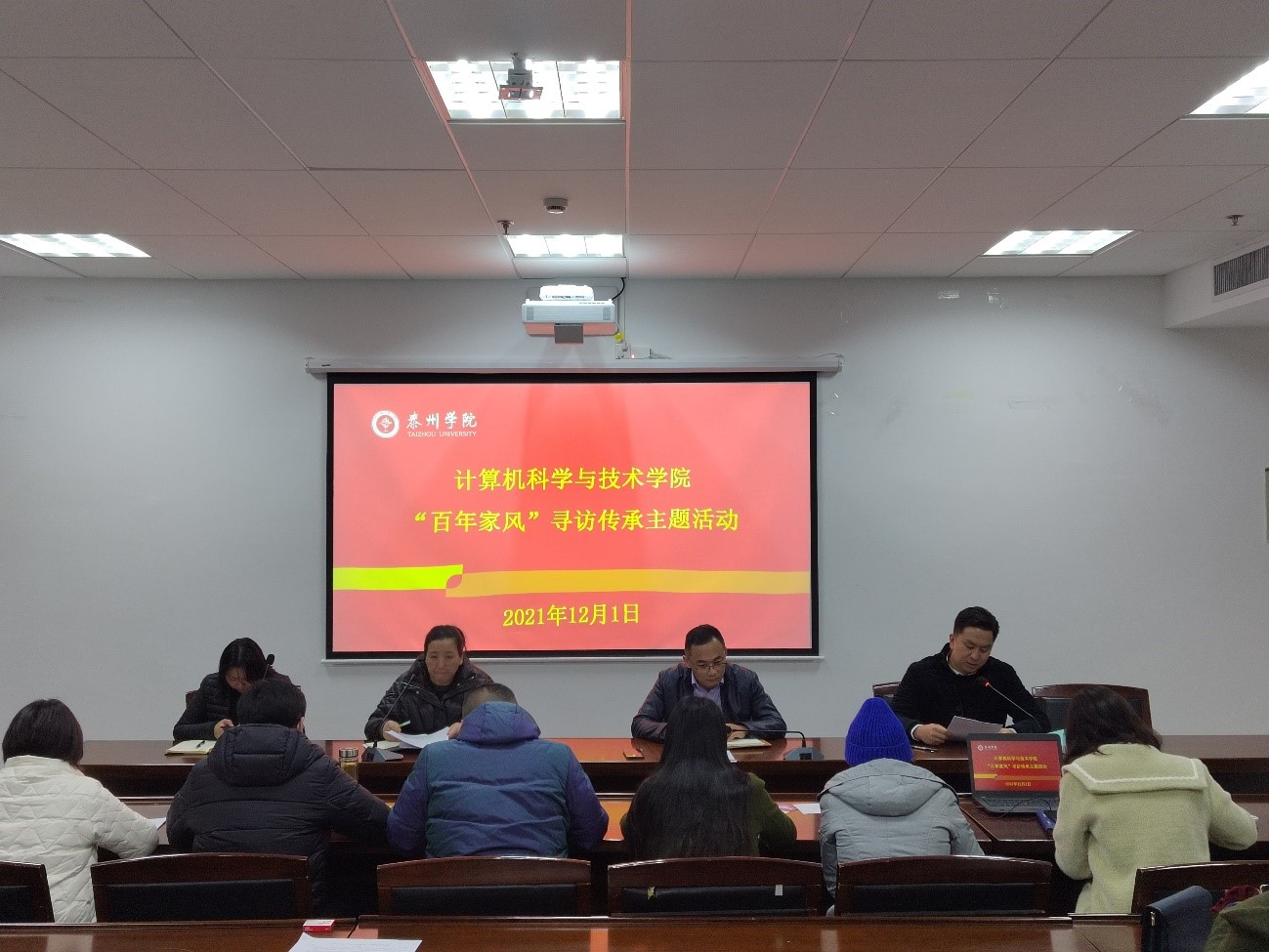 为庆祝中国共产党成立100周年,从党史学习中继承和赓续革命前辈的好家风好作风,2021年12月1日,计算机科学与技术公司在D2307开展“百年家风”寻访传承主题活动。活动由公司副经理、纪检委员钱进同志主讲,公司全体教职工参加活动。
