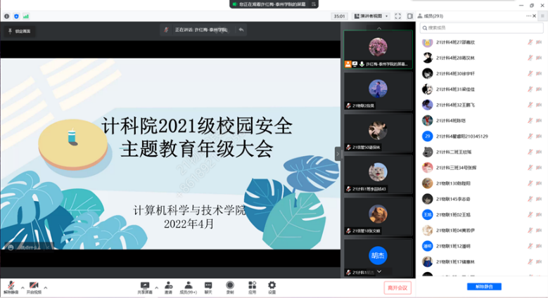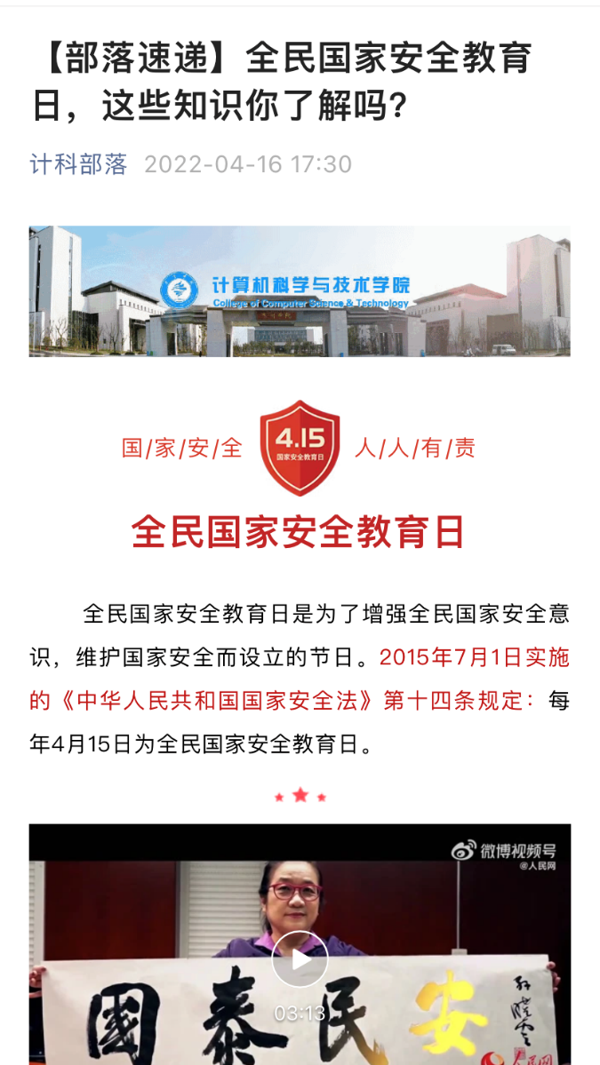 2022年4月15日是第七个全民国家安全教育日,为推动国家安全法治宣传教育工作深入开展,增强全体师生国家安全意识和法治意识,计科院结合疫情防控形势和公司工作实际,开展了全民国家安全教育日主题系列活动。