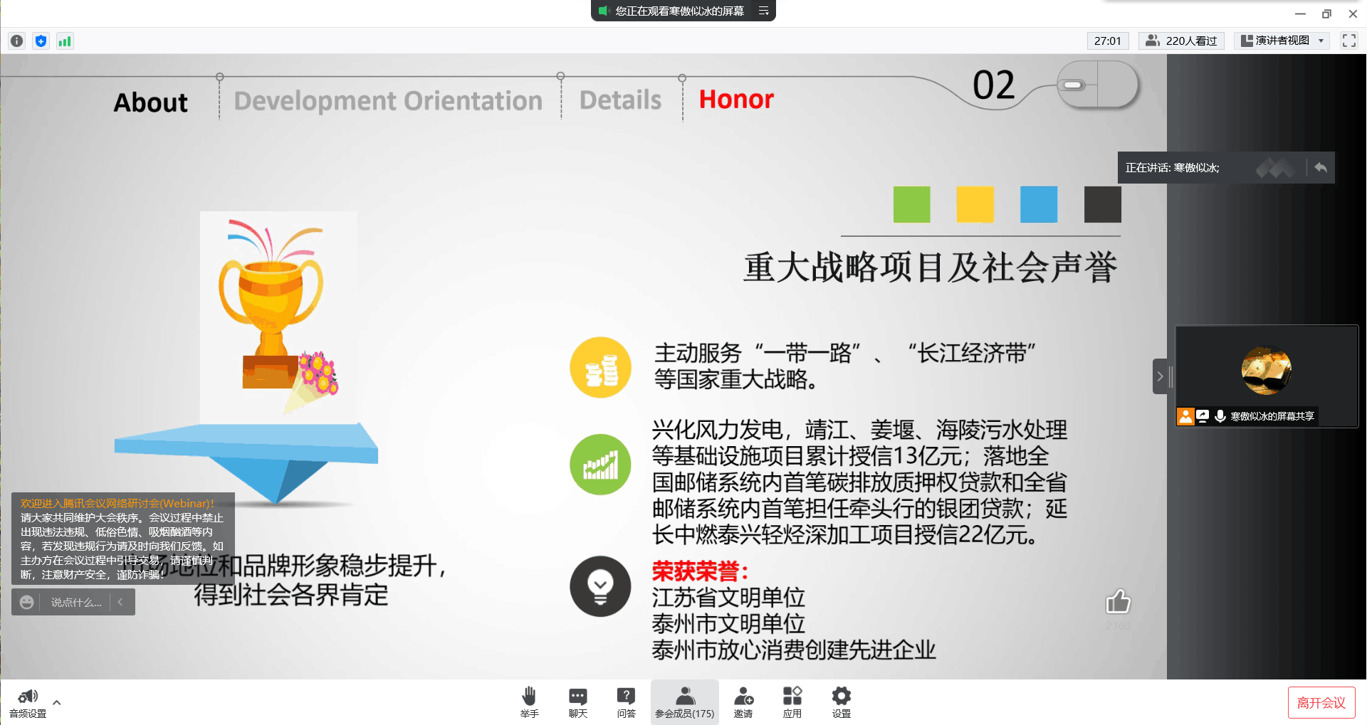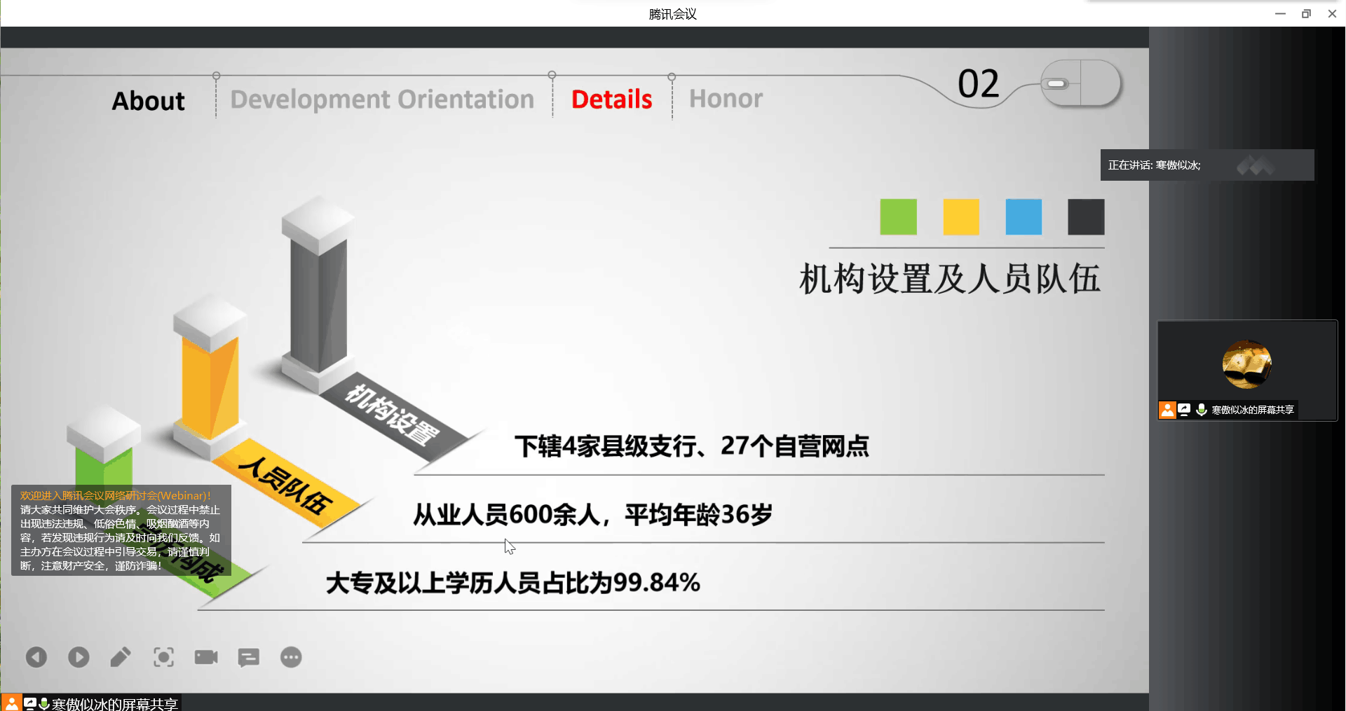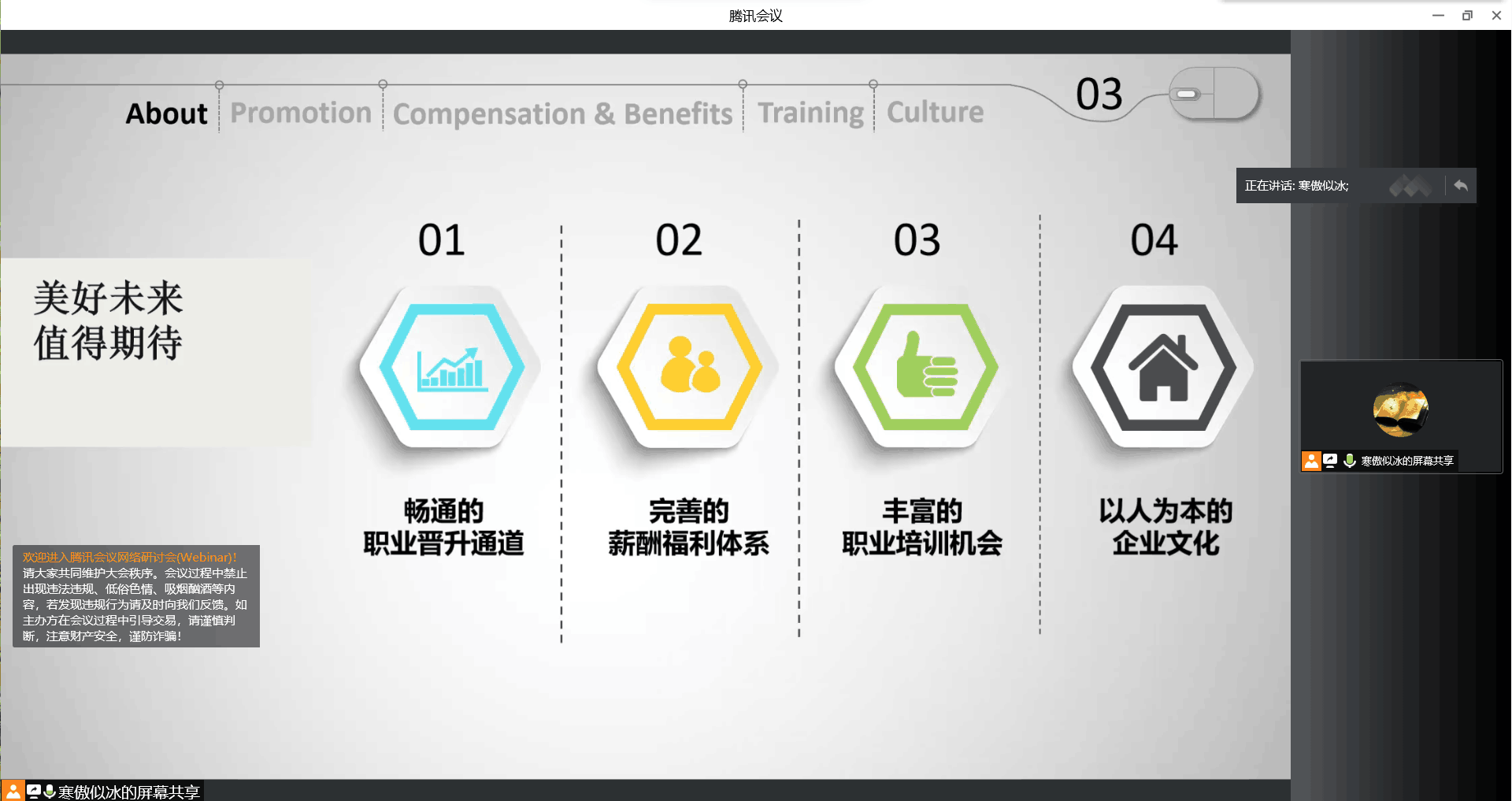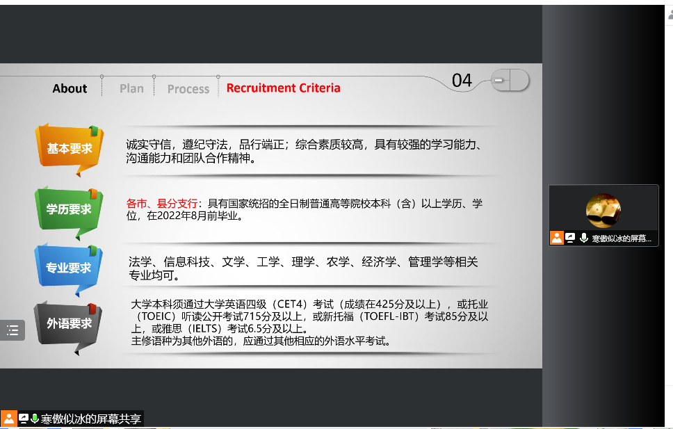 会议伊始,中国邮蓄泰州市分行人力资源团队负责人详细介绍了银行的概况、企业文化、晋升空间,对员工关心的应聘要求、薪资待遇等内容进行了条分缕析,并对同学们提出的疑问一一进行了解答。22届毕业生纷纷表示,通过这次线上就业招聘会,对中国邮储泰州市分行产生了较大的兴趣,就业选择也多了一个;通过本次招聘会,再次认识到了个人硬实力在应聘中的重要性,因此不论什么时候都应该努力学习,提升自己的各项能力,让自己具有更强的竞争力。