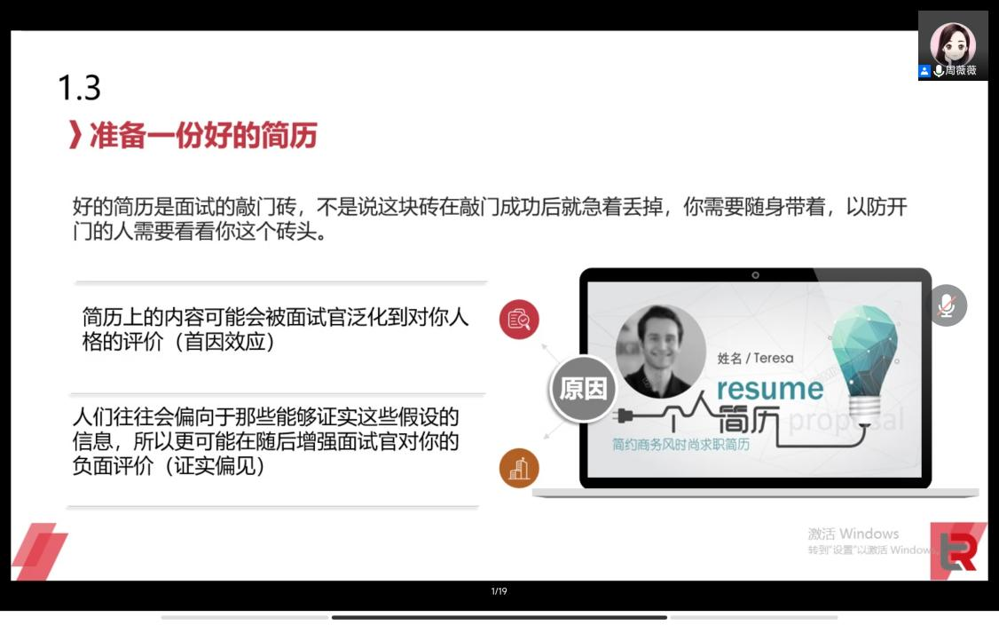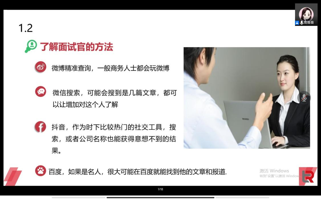 周薇薇首先从面试准备和时间观念上展开,指出面试时一定要充分了解即将竞聘的岗位,制定详细的说明书和好的简历。其次要讲究面试礼仪,做到衣着得体,谈吐方面大方坦然。最后向同学们透露了一些通关小技巧:一是做好工作计划,二是抓住自己的亮点,三是与企业HR保持紧密联系;四是不要起争论,五是认真聆听。讲座后同学们在线上积极地与周经理互动讨论,她再三强调一定要抓住自身优势并充分展示出来,这样才能让招聘单位HR眼前一亮。