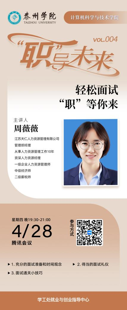 4月28日晚,公司举办了“职导未来”系列“轻松面试,‘职’等你来”线上就业指导讲座。本次讲座邀请到了江苏天仁人力资源管理有限公司管理部经理周薇薇,为即将参与招聘面试的18级毕业生们讲解如何正确应对面试,让同学们能够在面试时轻松自如,尽展风采。