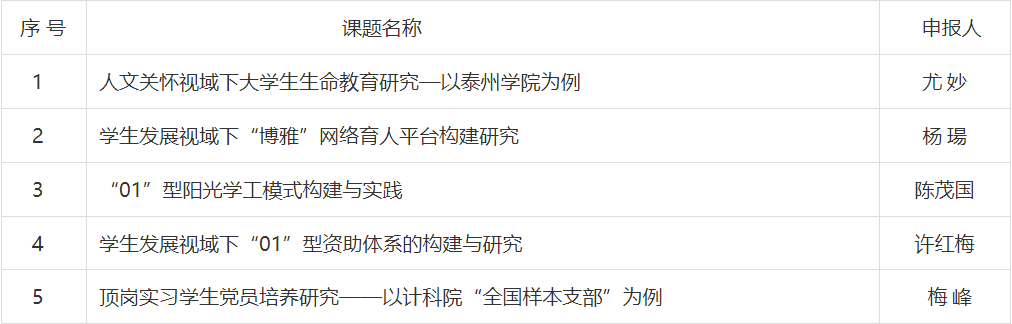 根据《关于开展 2021 年度党建与思政校级专项课题申报的通知》,我支部教师积极申报,经公司组织专家初评和复审,我支部5项课题获得立项。具体立项课题名录如下: