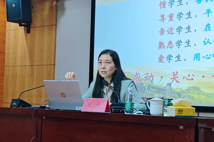张平老师以态度、方法、情怀为题,通过历代领导人对青年人的希望与寄语,阐述了新时代青年人的重要性。接着,他通过老员工中存在的典型问题,指出辅导员及班主任关爱员工的必要性,并引出新时代对高校老师的要求。她结合自身的日常生活及工作经验,提出新时代老师应抱有的态度、具体运用的方法以及涵养情怀的要求。最后,张平送给大家一句话:“勿忘昨天的初心,无愧今天的使命,不负明天的梦想,一程山水一年华,一生无悔一生情。”