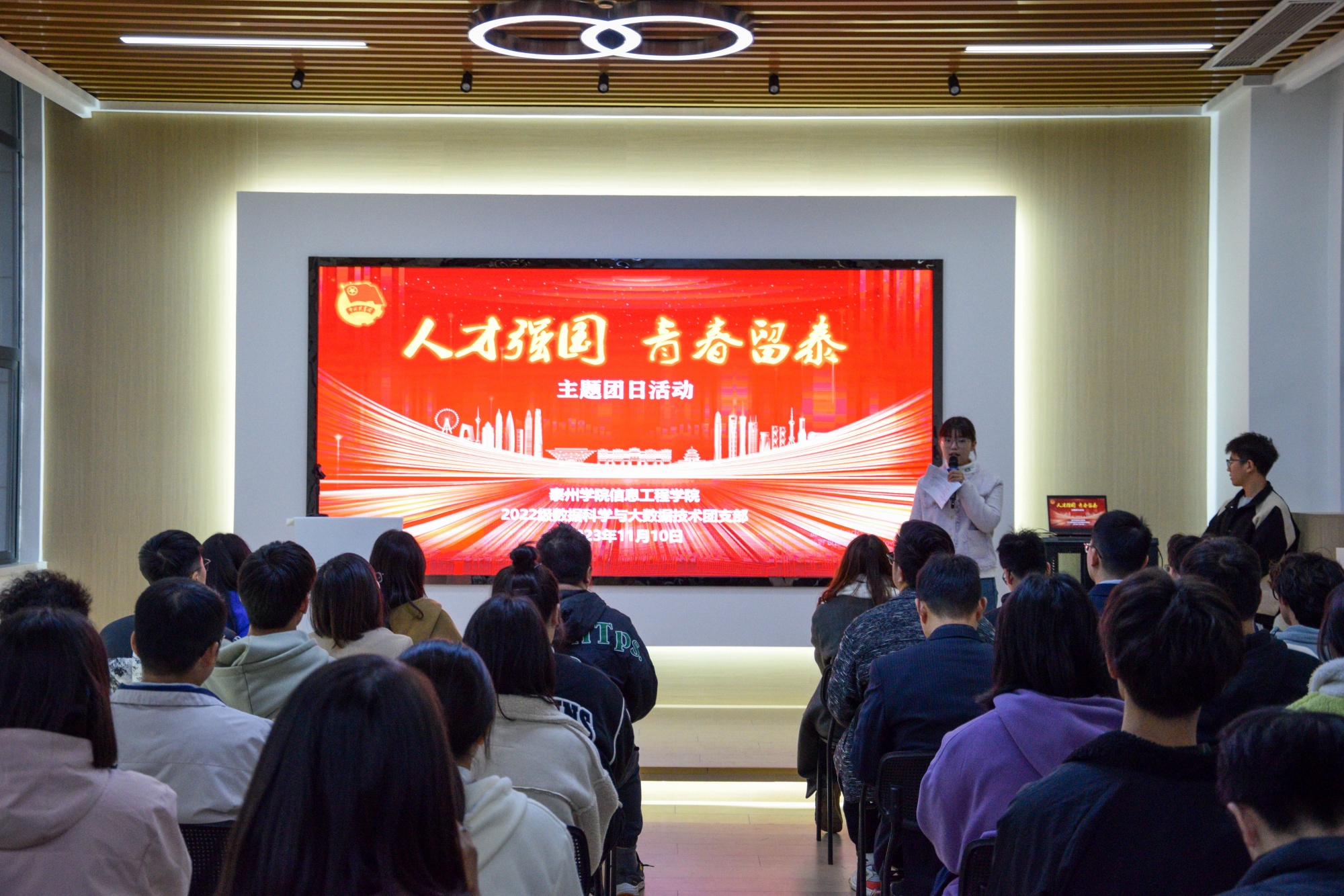 2022级数据科学与大数据技术专业班主任李金海老师介绍了泰州市委书记朱立凡在青年和人才友好型城市建设大会上的讲话精神,希望同学们能和他一起在泰州实现自己的人生理想。党政青年谈润陆、乡村振兴志愿者王恪珉、企业专业技术岗周彦霖三位毕业生代表就为何选择留泰分享了自己的感受和经历,并对学弟学妹们的发展成长、职业规划等提供了诸多建议。
