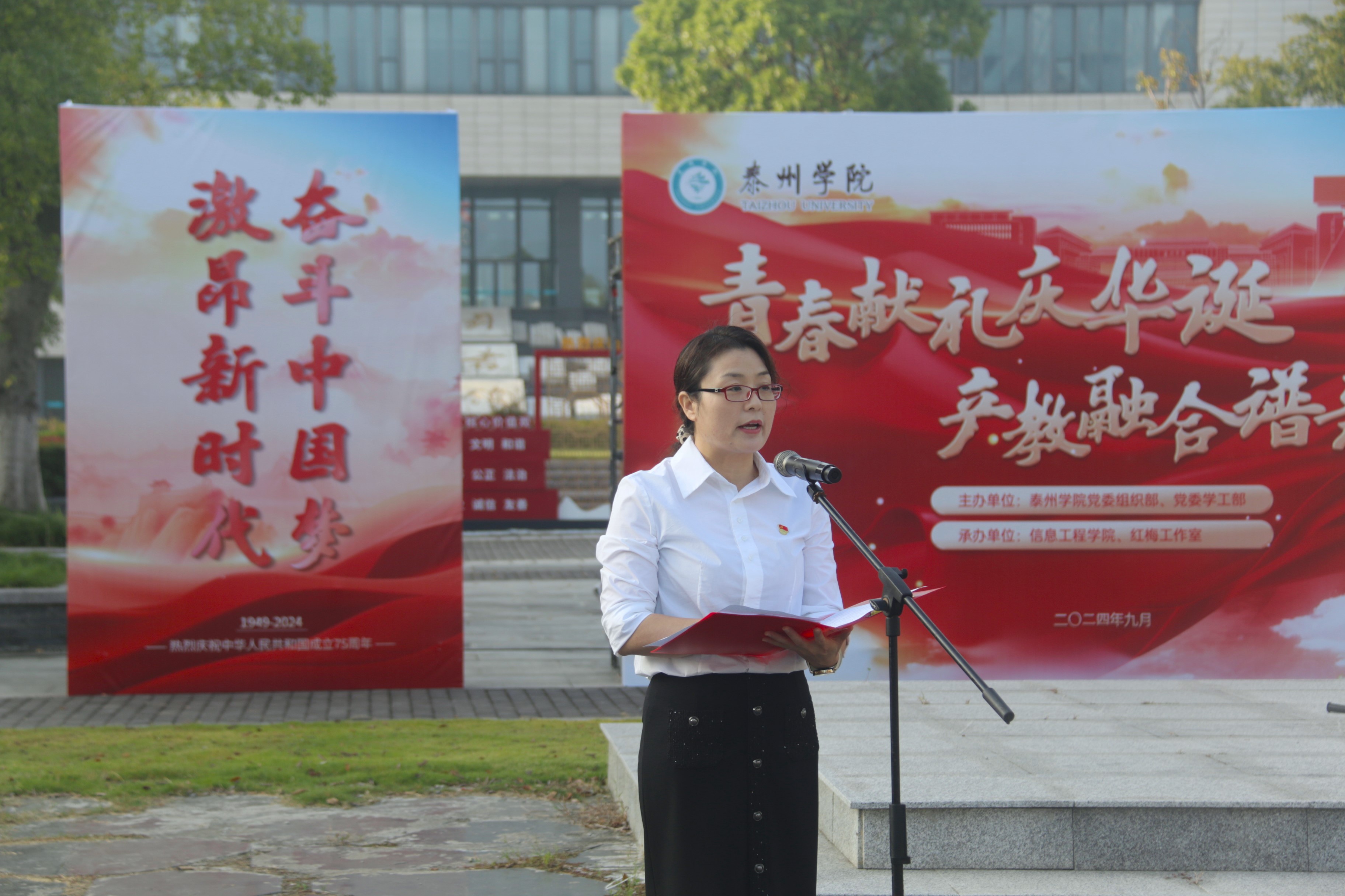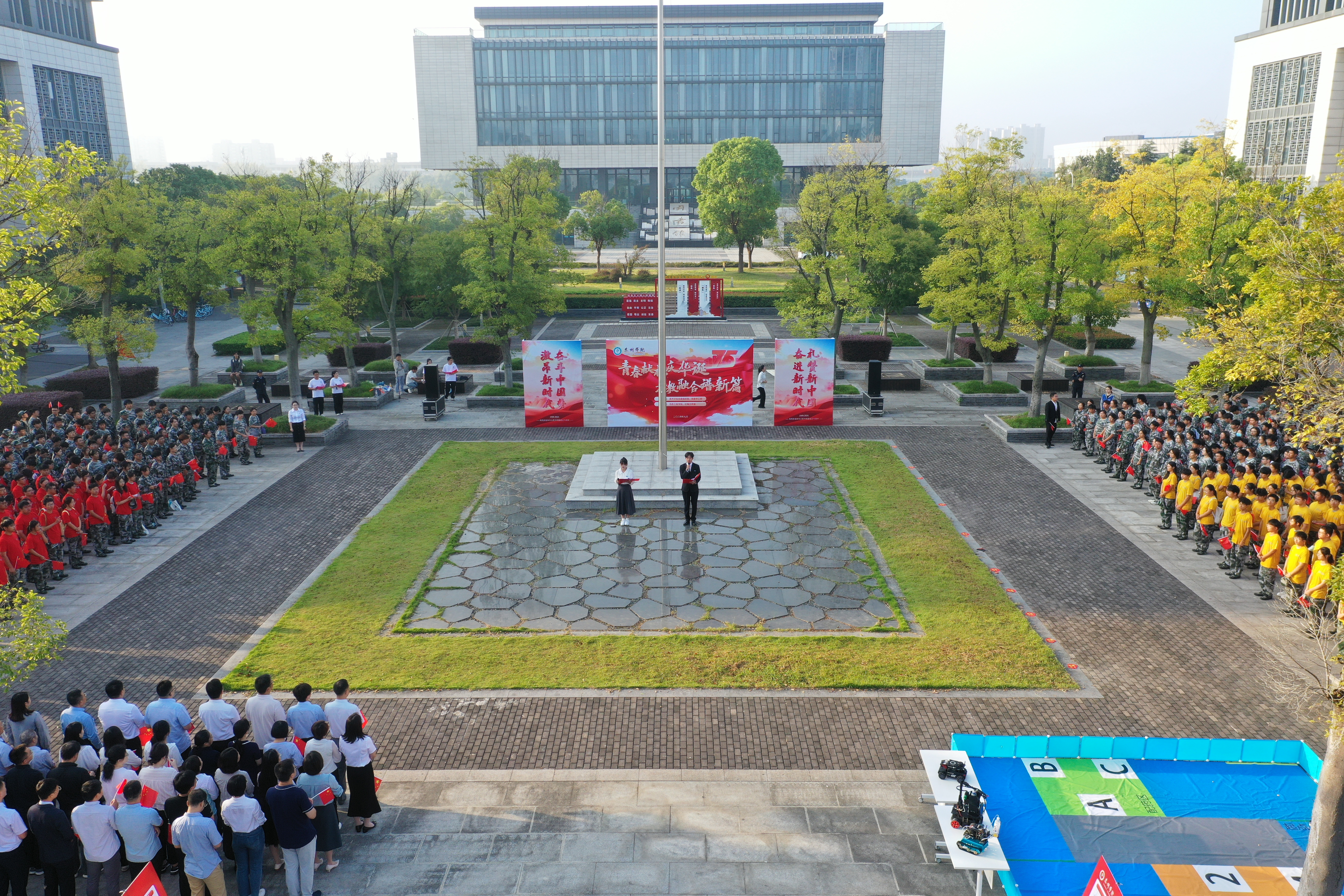 活动分为三个阶段。第一阶段,在胡瑗广场隆重举行庆祝中华人民共和国成立75周年升国旗仪式。伴随着雄壮有力的《义勇军进行曲》,鲜艳的五星红旗冉冉升起。国旗下,全体人员庄严肃立,齐声高唱国歌,深情祝福伟大祖国繁荣昌盛。师生代表激情朗诵的诗歌《我是党员奋斗有我》,将全场振奋人心的氛围推向高潮。公司党总支书记杨智红领学了党的二十届三中全会精神,并圈出关于教育、科技、人才论述的部分内容。教师代表、企业代表及员工代表依次发表学习心得,纷纷畅谈助力教育科技人才协同融合发展的决心和举措,为奋力实现中国式现代化、发展新质生产力挺膺担当。第一阶段活动在一曲由全场师生倾情演绎《歌唱祖国》的嘹亮歌声中圆满结束。