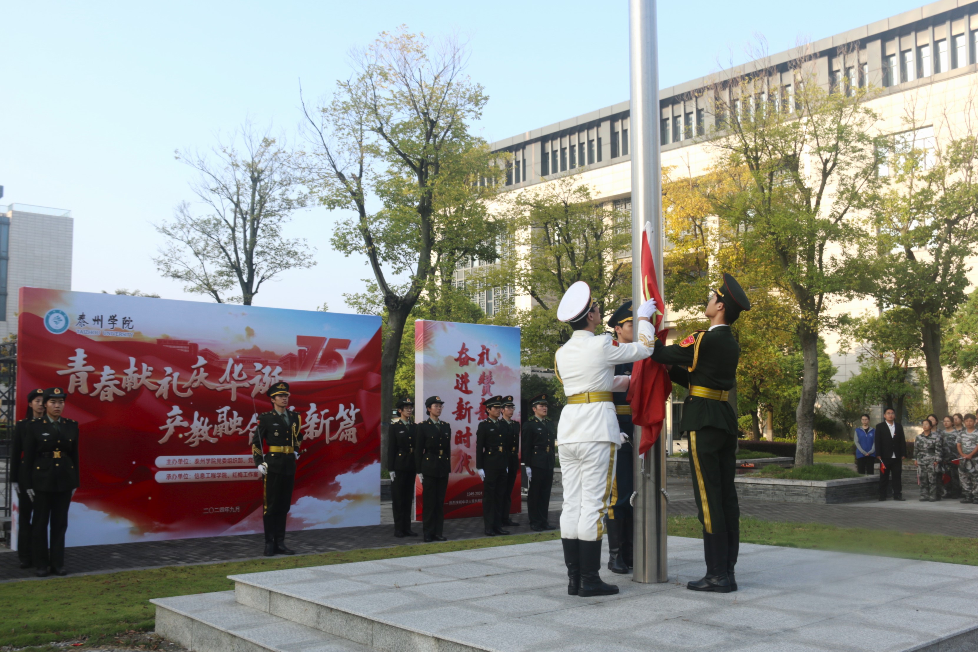 为庆祝中华人民共和国成立75周年,充分发挥党建引领作用,推动高校与地方在组织共建、产业研究、技术合作和人才培养等方面的交流,9月29日,谈球吧在公司胡瑗广场举行“青春献礼庆华诞 产教融合谱新篇”联学共建主题党日活动暨产教融合党建联盟签约仪式。公司党委组织部、宣传部、学工部主要负责人,海陵区科技局、市数据产业集团、中国电信泰州分公司、中国人保泰州分公司、江苏泰州大桥有限公司、金泰环保热电集团等企业代表20余人出席活动,谈球吧全体教职工及24级全体新生500余人参加活动。