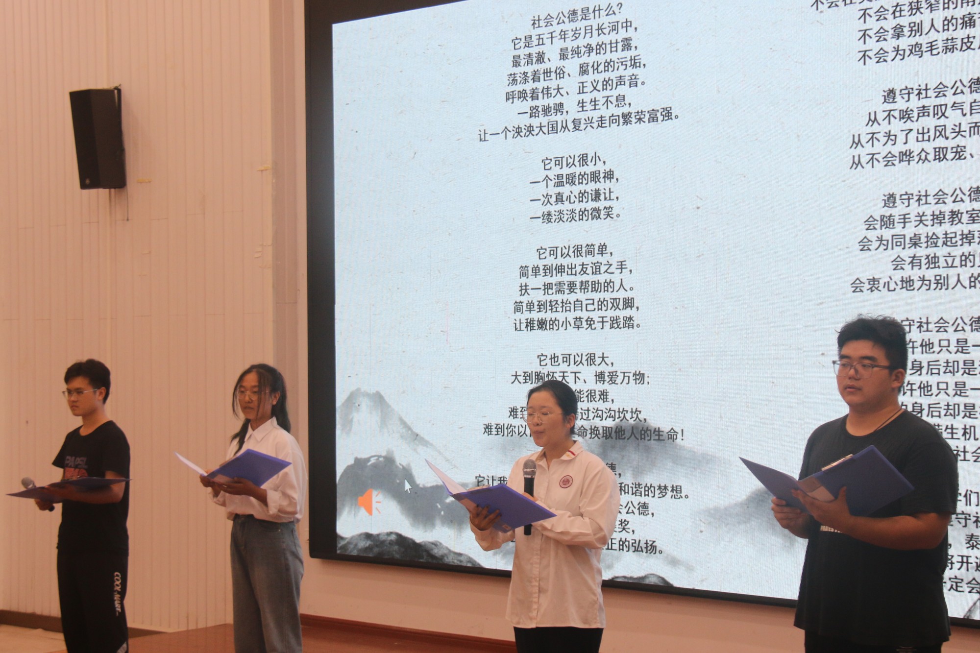 本次道德讲堂共设作省身、诵诗歌、看短片、讲故事、谈感悟、送吉祥等六个环节。活动伊始,同学们观看了有关校园文明现象的视频短片,通过图片、词云和现场扫码信息搜集等形式呈现出校园中存在的讲文明和不文明现象,结合自身实际以“三问三省”的形式进行深刻的自我反思。诗歌诵读《做一个有社会公德的人》,让同学们进一步理解礼貌待人、爱护环境的重要性。讲故事环节,明帝尊师重教和列宁排队理发的故事引发了员工们对文明礼仪和恪守公德的思考。