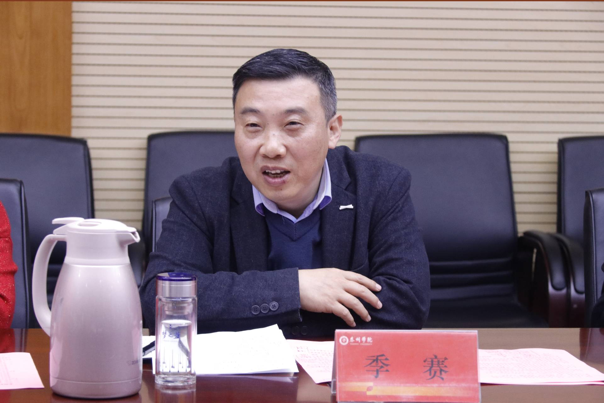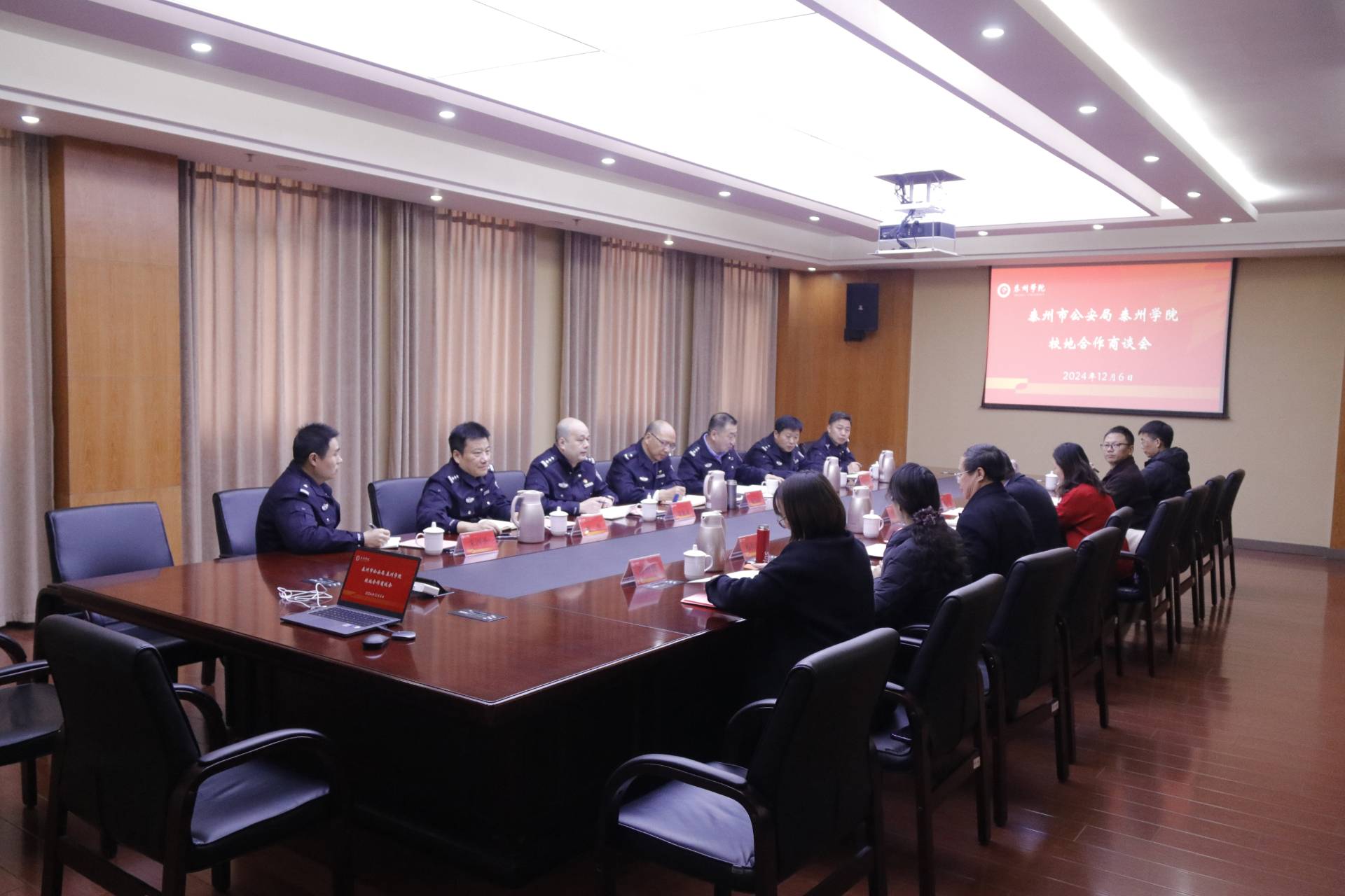 2024年12月6日上午9时30分,泰州市公安局党委委员、副局长赵旭晴、张劲松一行赴谈球吧体育官网进行校地合作商谈,会议在谈球吧体育官网明达楼(行政楼)1505会议室顺利举行。泰州公司党委副书记、董事长季赛,党委常委、副董事长薛小平等校领导及相关部门负责人出席了会议。此次会议旨在深化双方在警务信息化和人才培养方面的合作,共同推动社会治理数字化和互联网经济提速发展。